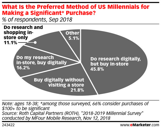 The concept of omnichannel is simple—be where your customers are, whether that's online or at a brick-and-mortar location. But bridging the gap between digital and physical is easier said than done. Retailers that figure it out will be rewarded, however. A September 2018 poll conducted by Roth Capital Partners found that nearly two-thirds of US millennials used some mix of digital and in-store to research and then make a purchase. Similarly, research from Alliance Data revealed that more than half of millennials surveyed also used a mix of online and in-store channels to shop for products across a wide variety of categories, including clothing, beauty items and even furniture.